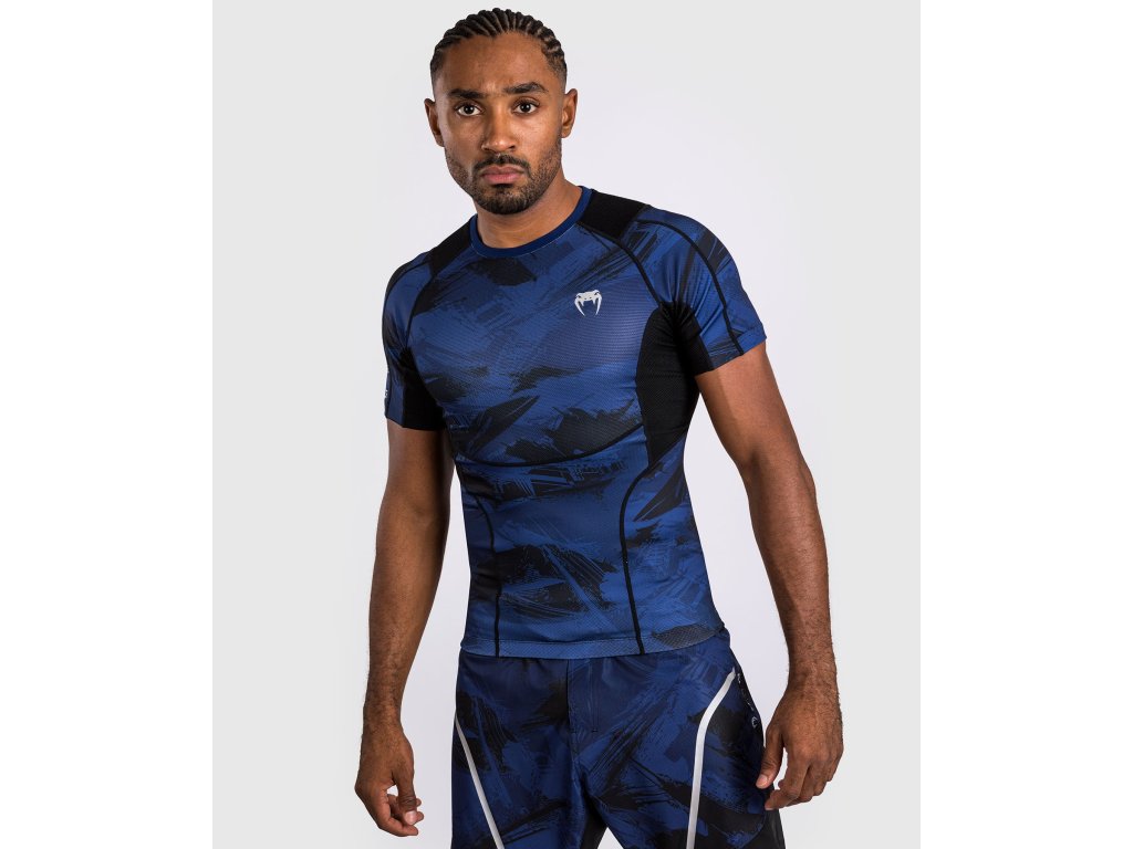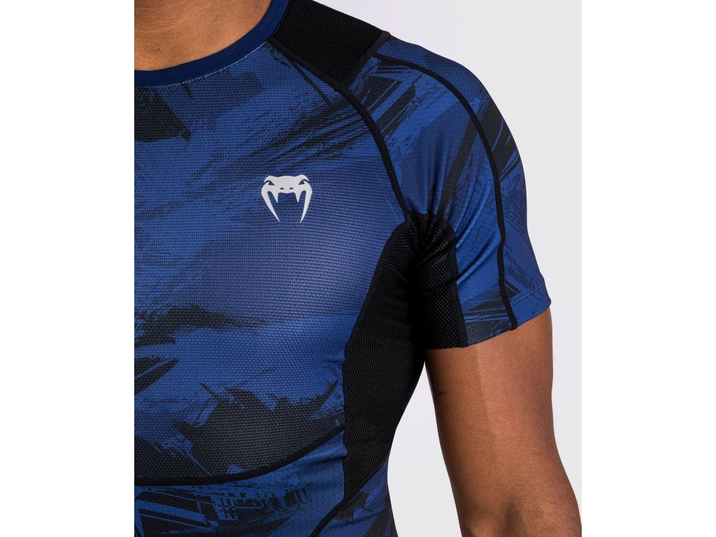 The rashguard’s brush-stroke camouflage print in Navy Blue delivers urban style, with a silver Venum logo at the chest, sleeve and back of the neck.